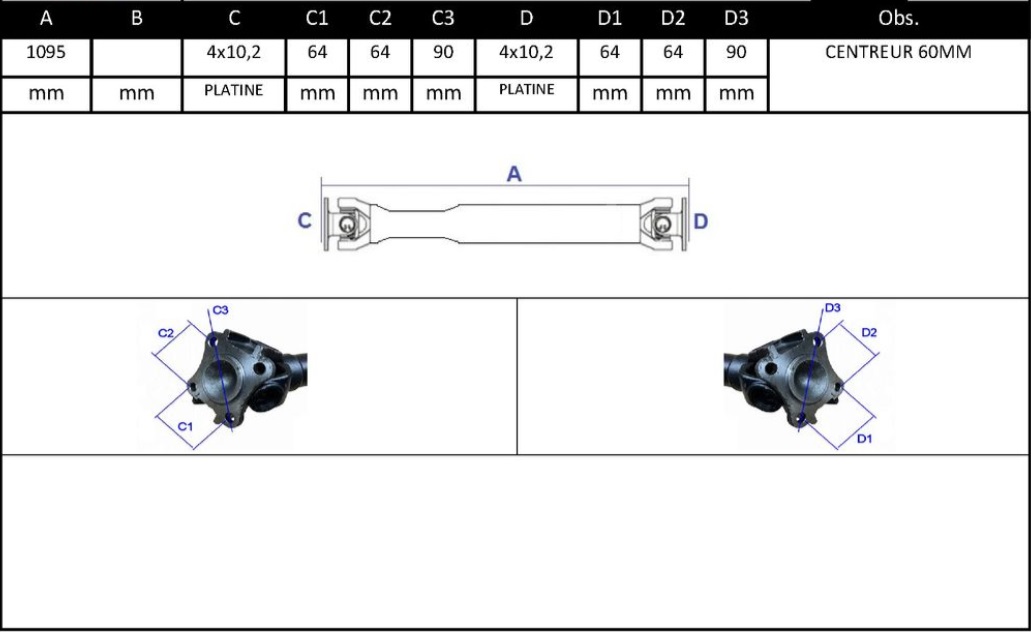 Observações: Comprimento Total 1095mm, Apoio 0, Central Traseira